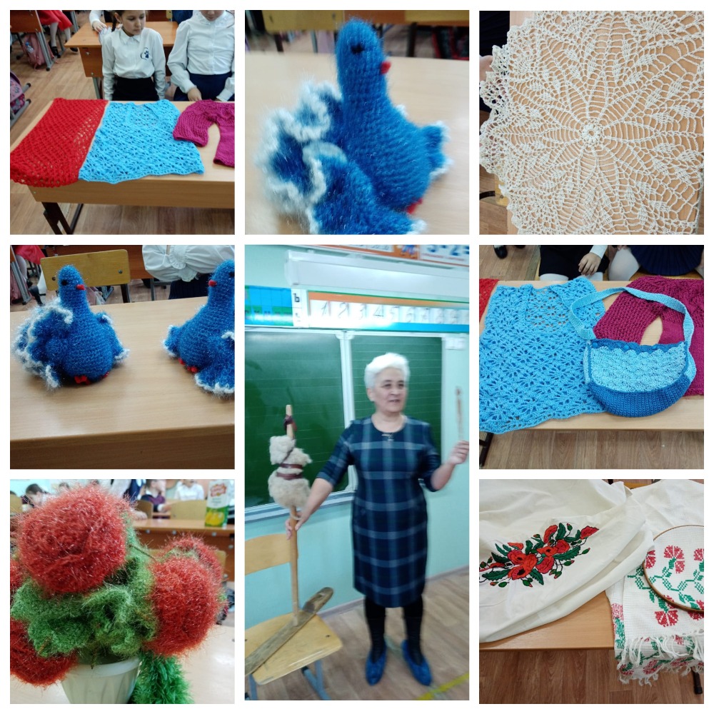 Классный руководитель Кулагина Л.В. тоже рассказала о своих родителях, О маме, которая кроме вязания, занималась еще и вышивкой(гладью), папа- резьбой по дереву, а дедушка умел катать валенки, класть печи. Была организована небольшая выставка.