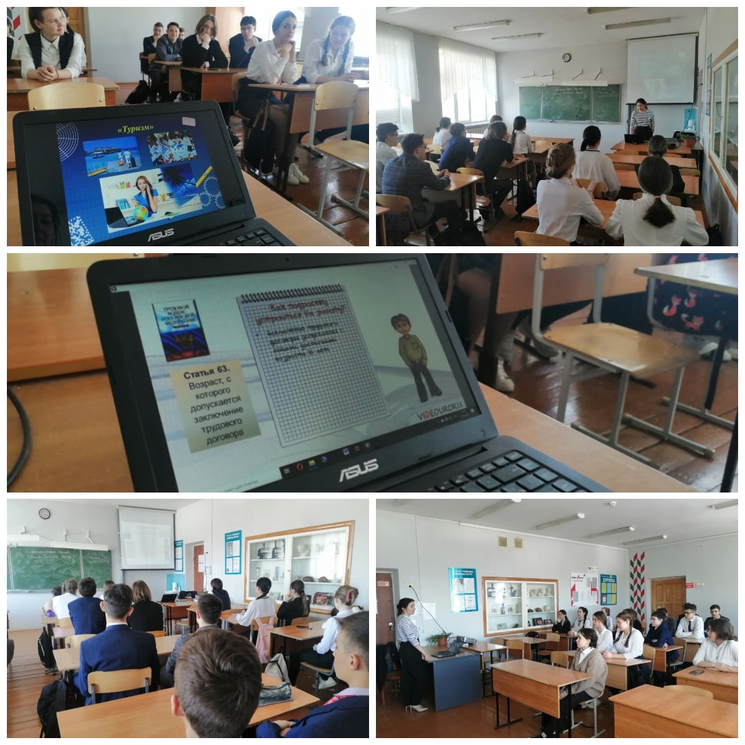 Совместно с филиалом ГКУ Северо-западный межрайонный центр занятости населения по Янаульскому району 22 апреля 2022 года в 9б классе социальным педагогом проведен классный час на тему: "Трудоустройство несовершеннолетних". Целью проведения классного часа является расширение правовых знаний в области трудовых отношений и разъяснение понятий: трудоустройство, трудовой договор, трудовая книжка, время отдыха, увольнение и т. д. Также рассмотрели профессии в сфере" Туризм".