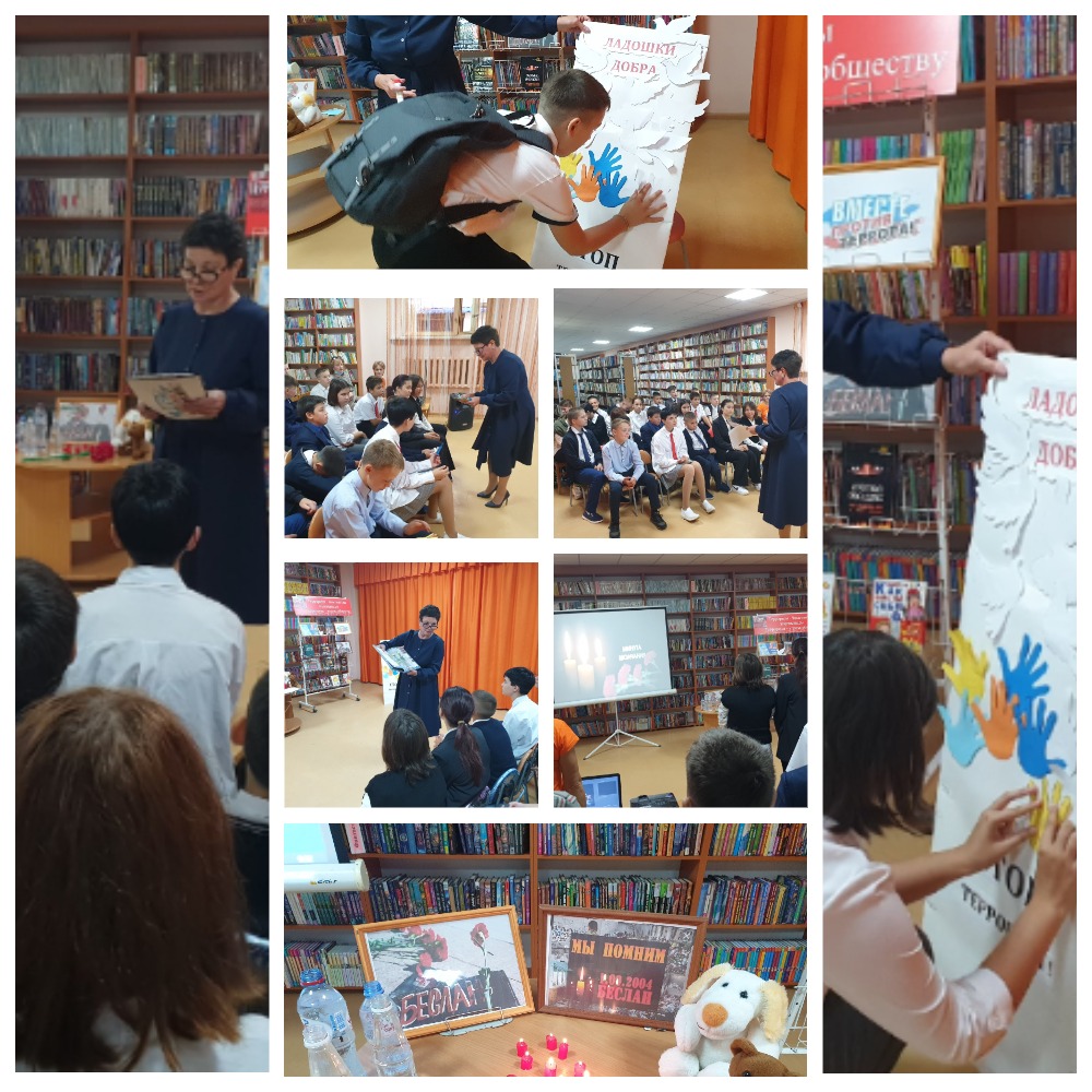 Была организована стилизованная выставка «Мы помним» и книжная выставка «Терроризм - угроза обществу» и сделан обзор книг. В ходе мероприятия детям было предложено игра-ситуация «Если бы…», где ведущая описывала жизненно важные ситуации, а дети предлагали свои варианты ответов выхода. На стенде «Ладошки добра» учащиеся на разноцветных ладошках поделились добрыми пожеланиями.