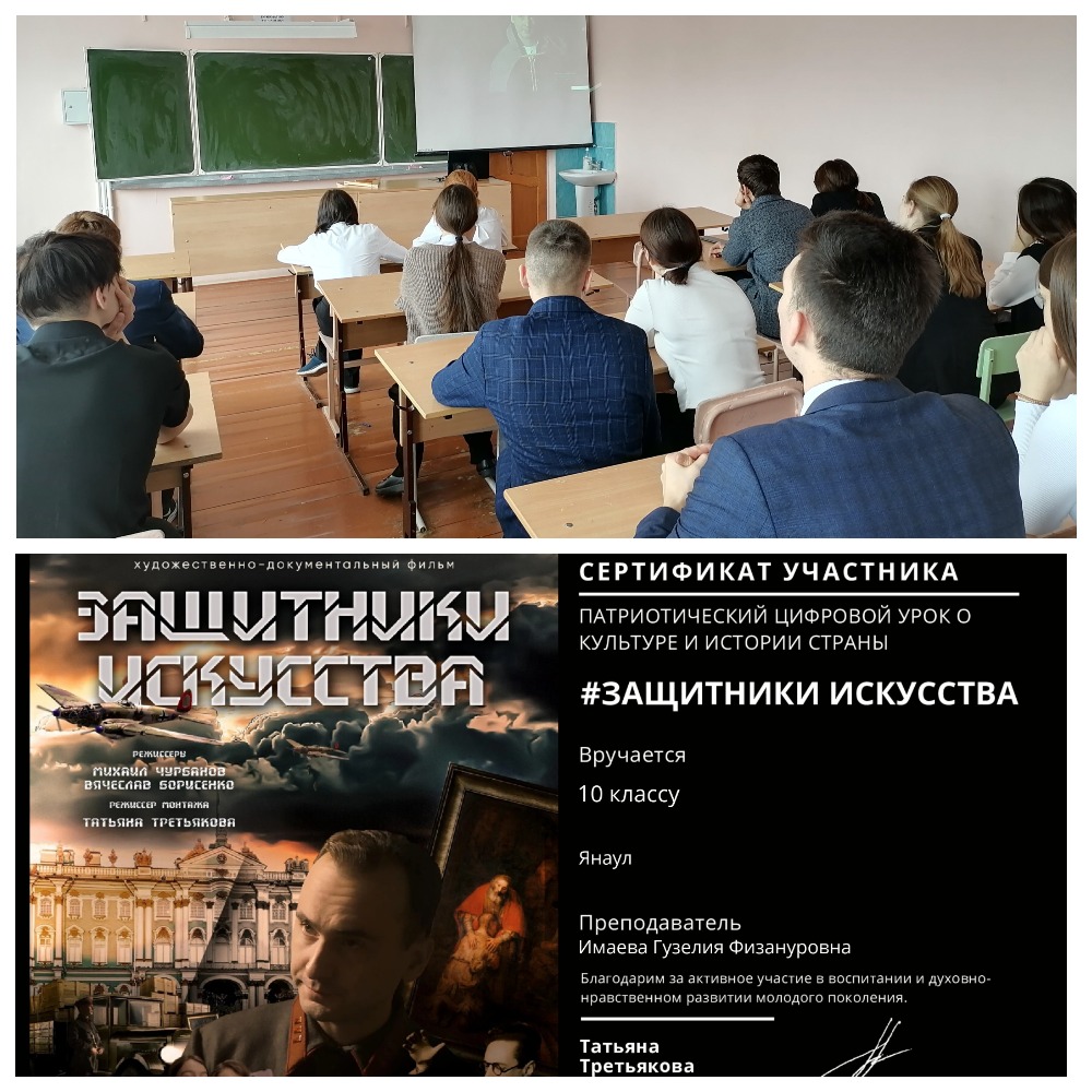 6 марта 2023 года обучающиеся 10 класса школы приняли участие в федеральном проекте Мотивирующие цифровые уроки" и посмотрели патриотический цифровой урок о культуре и истории страны "Защитники искусства". Урок построен на фильме "Защитники искусства", который знакомит ребят с беспрецедентной в истории музейного дела "стремительной" эвакуацией экспонатов Государственного Эрмитажа в первые два месяца Великой Отечественной войне и о вкладе нашего народа в сохранение мирового культурного наследия. Вместе с героями фильма учащиеся попробовали разобраться в ценности искусства для человека, в том, как искусство воспринимается и как влияет на нас. Благодаря погружению в события военных лет, в атмосферу состоявшегося в первый послевоенный год Нюрнбергского процесса, ребята поняли, какую угрозу много лет назад отвели наши доблестные войны от нашей земли, советских людей и нашей культуры.